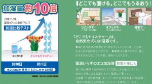 自然蒸発の10倍蒸発するフィルターが吸水することで加湿する仕組みです。