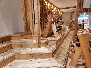 中には木のおもちゃやアスレチックなど遊び道具がたくさんあり、