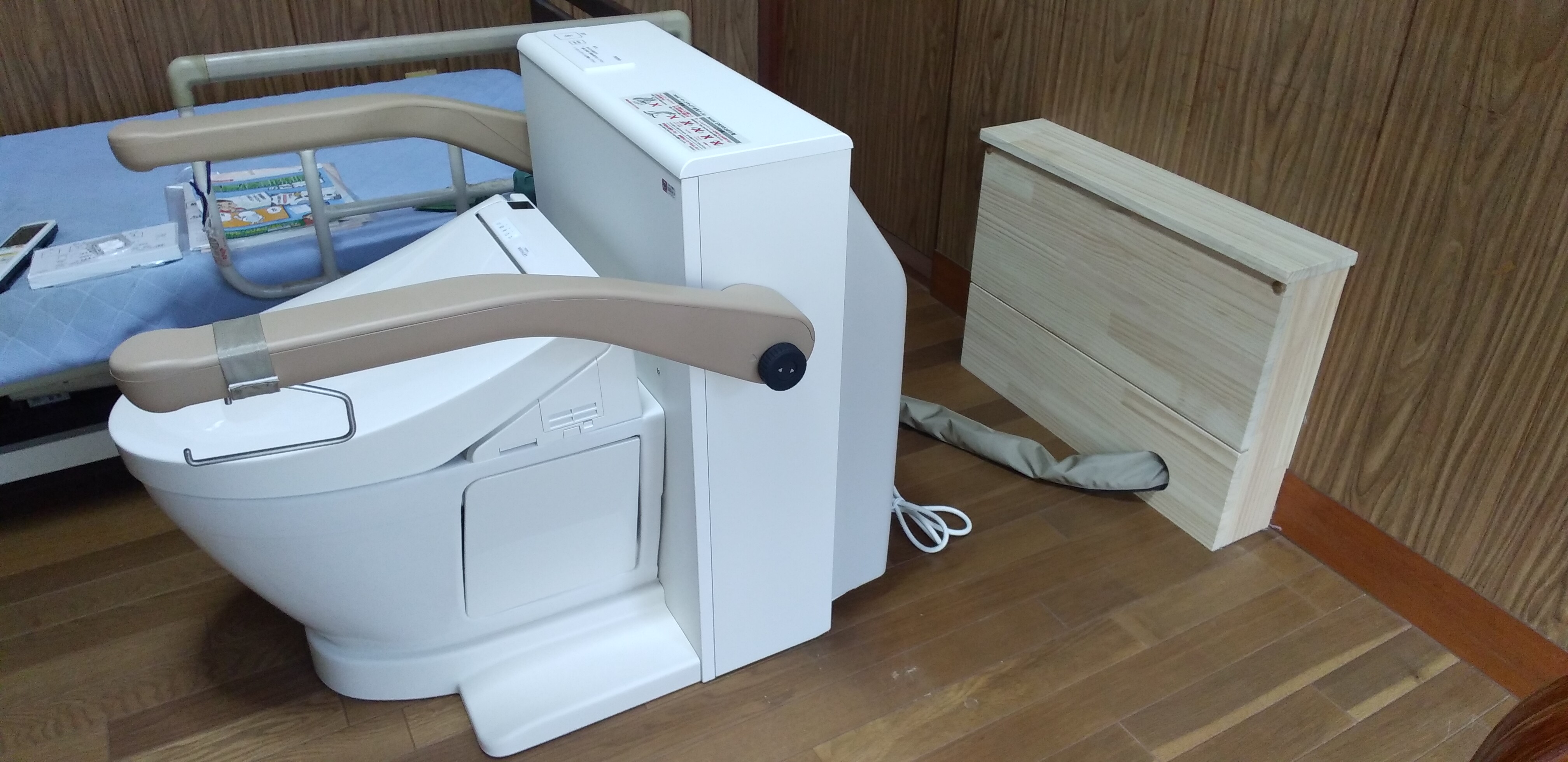 先日、水洗式のポータブルトイレを設置いたしました。 TOTO製「ベッドサイド 水洗トイレ」です。 自宅のトイレまで移動が難しい方など、寝室にポータブルトイレをご用意します。 しかし、やはり処理の事や臭いが気になります。 今回、設置させていただいたご利用者様宅では、上記の問題を解決されるために水洗トイレの導入になりました。 給水配管ホースの長さ分、ポータブルを移動することも可能です。 主介護である息子様、とても喜んでいただき、私もうれしかったです。