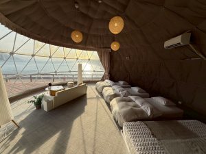 ドームテントの中は広く、海に向いた大きな窓から夕日が差し込む景色が最高!