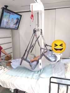今回、ベット移乗の際に臥位移動されていたご利用者様に「リフト移乗」を体験して頂きました。